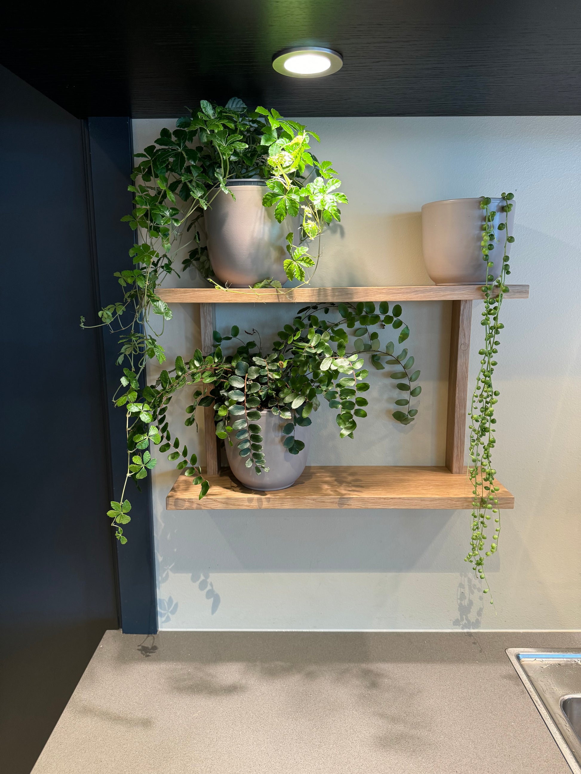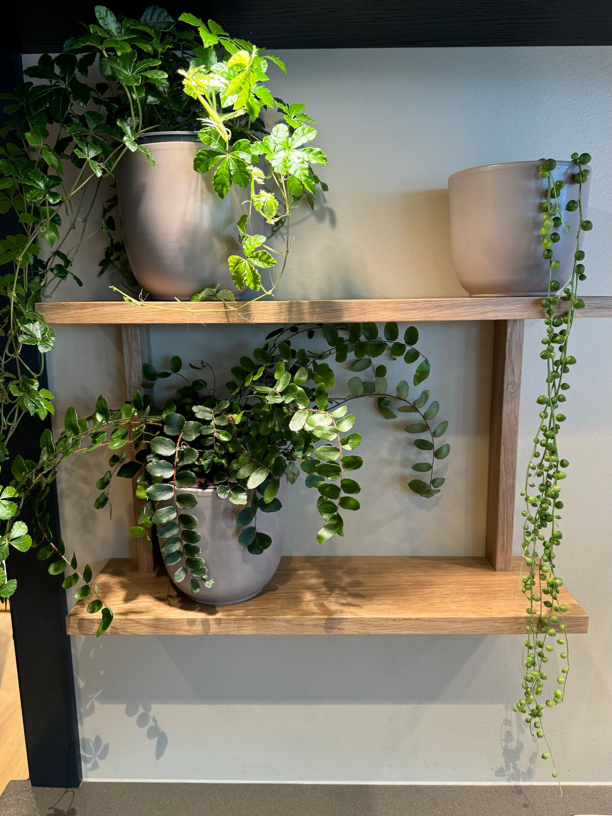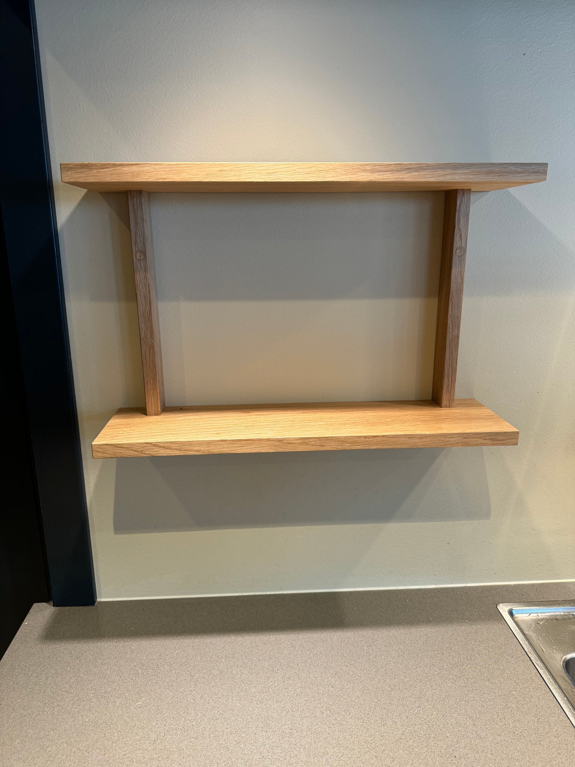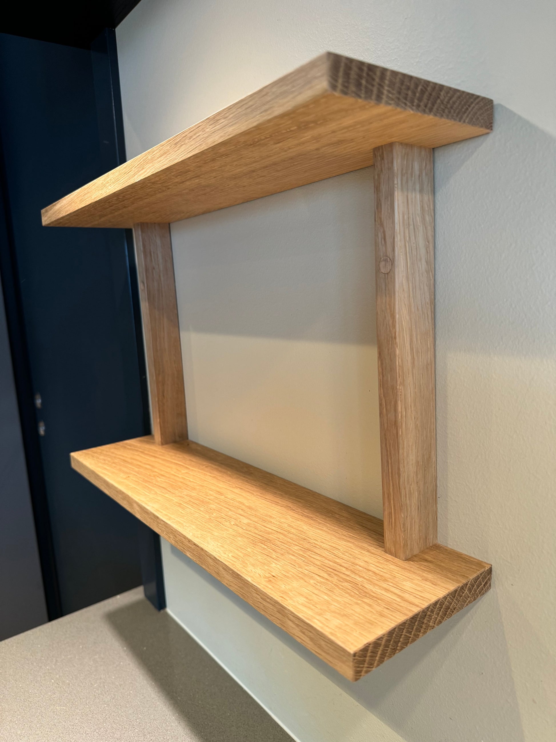 Hylle i eik. B: 40 cm. H: 25 cm. D: 12 cm. Behandlet i matt Osmo hardvoksolje. To skruer følger med til oppheng med "nøkkelhull"-beslag på baksiden.