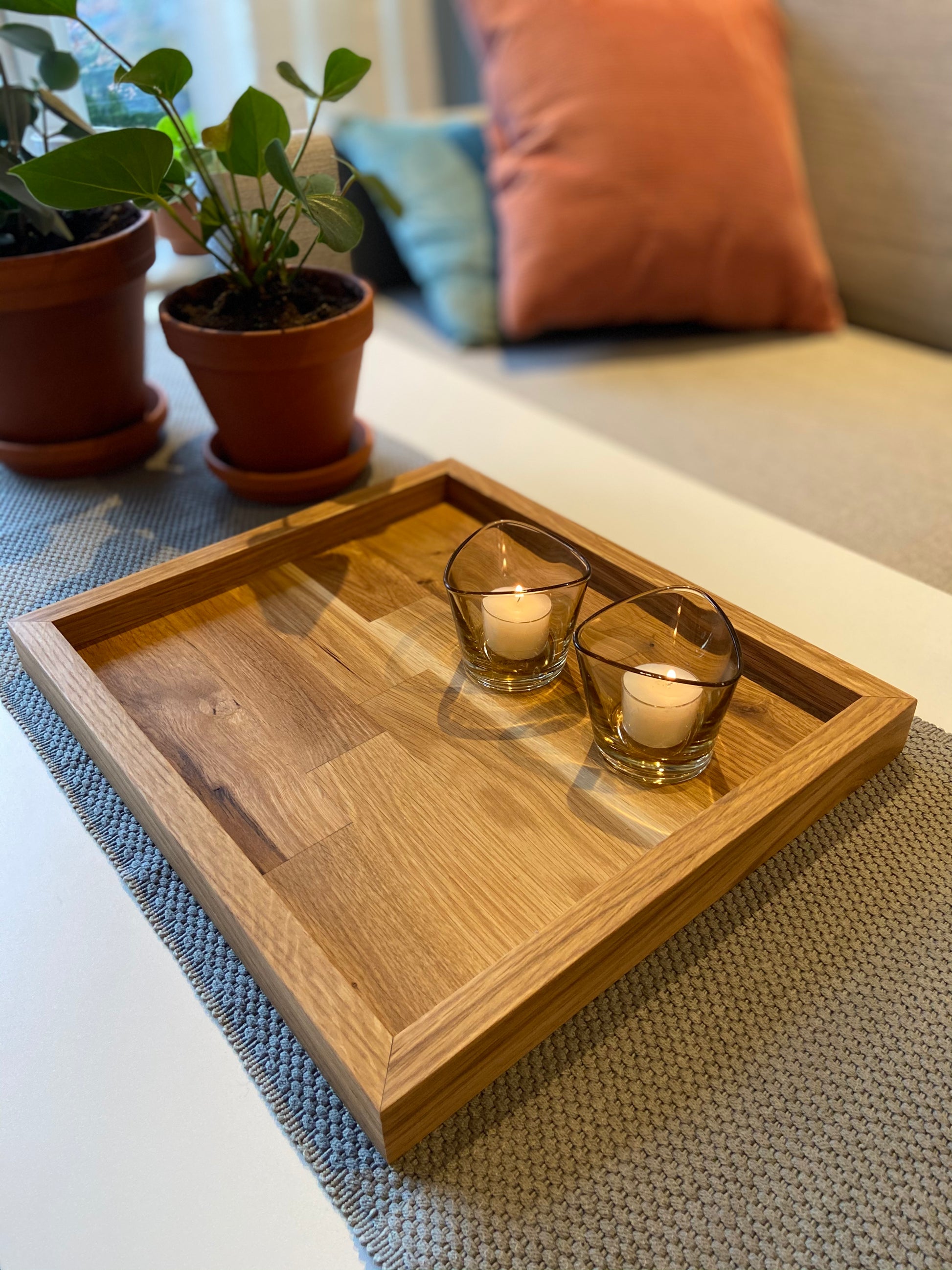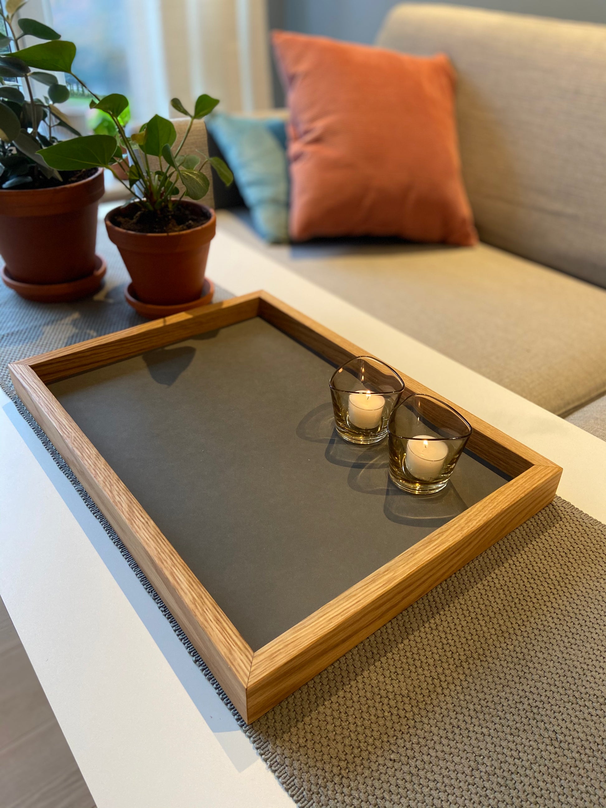 Serveringbrett i eik og valchromat. Har enten blå eller grå bunn. Har også et med eikebunn. Dimensjoner valchromat: 50 cm x 37 cm x 4 cm. Dimensjoner eikebunn: 33 cm x 38 cm x 4 cm.